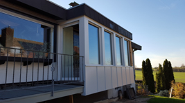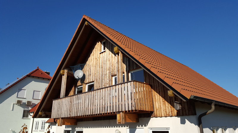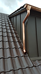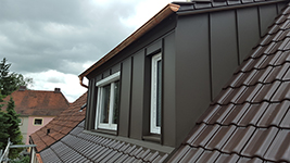 Gaube von außen komplett mit Polystyrolplatten gedämmt. Gaubenverkleidung mit braunem Alublech inkl. neuer Dachrinne und neuem Fallrohr aus Kupfer.
