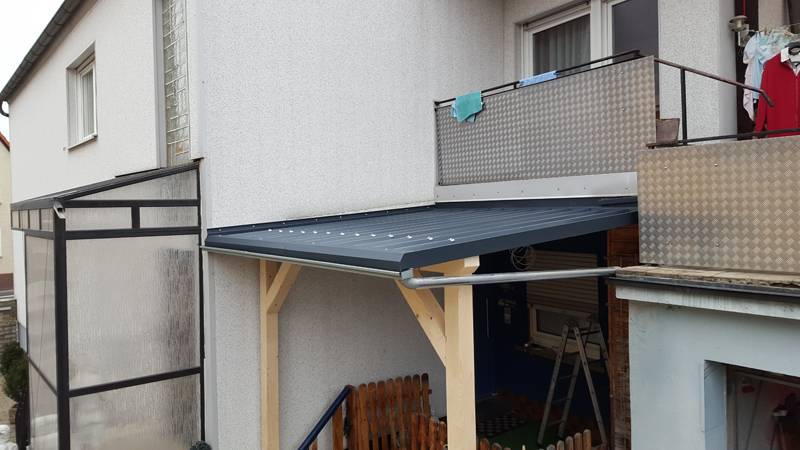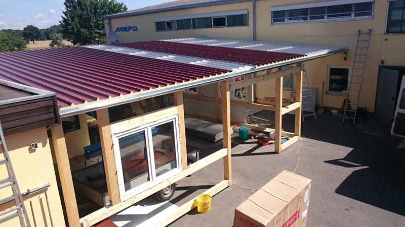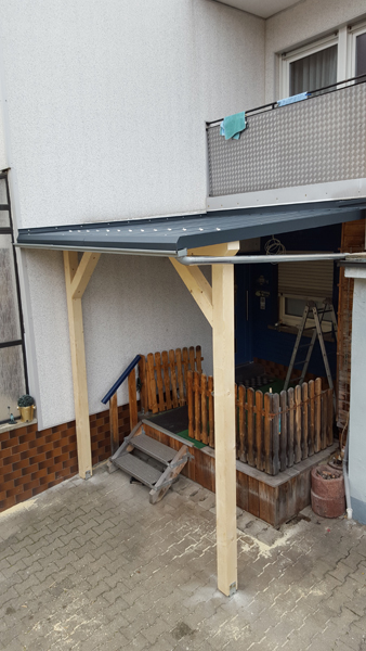 Windfang in Michelau (komplett selber gebaut). Balkenkonstruktion mit Sanwichpaneelen verkleidet, Fenster eingebaut, Blechdach